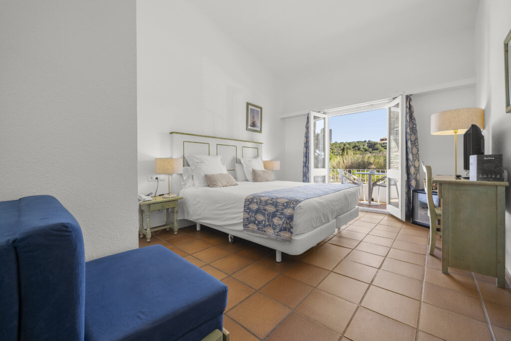 Acogedora habitación doble con vista a la montaña y orientación lateral al mar, desde donde se puede disfrutar de la luz y la brisa del Mediterráneo.